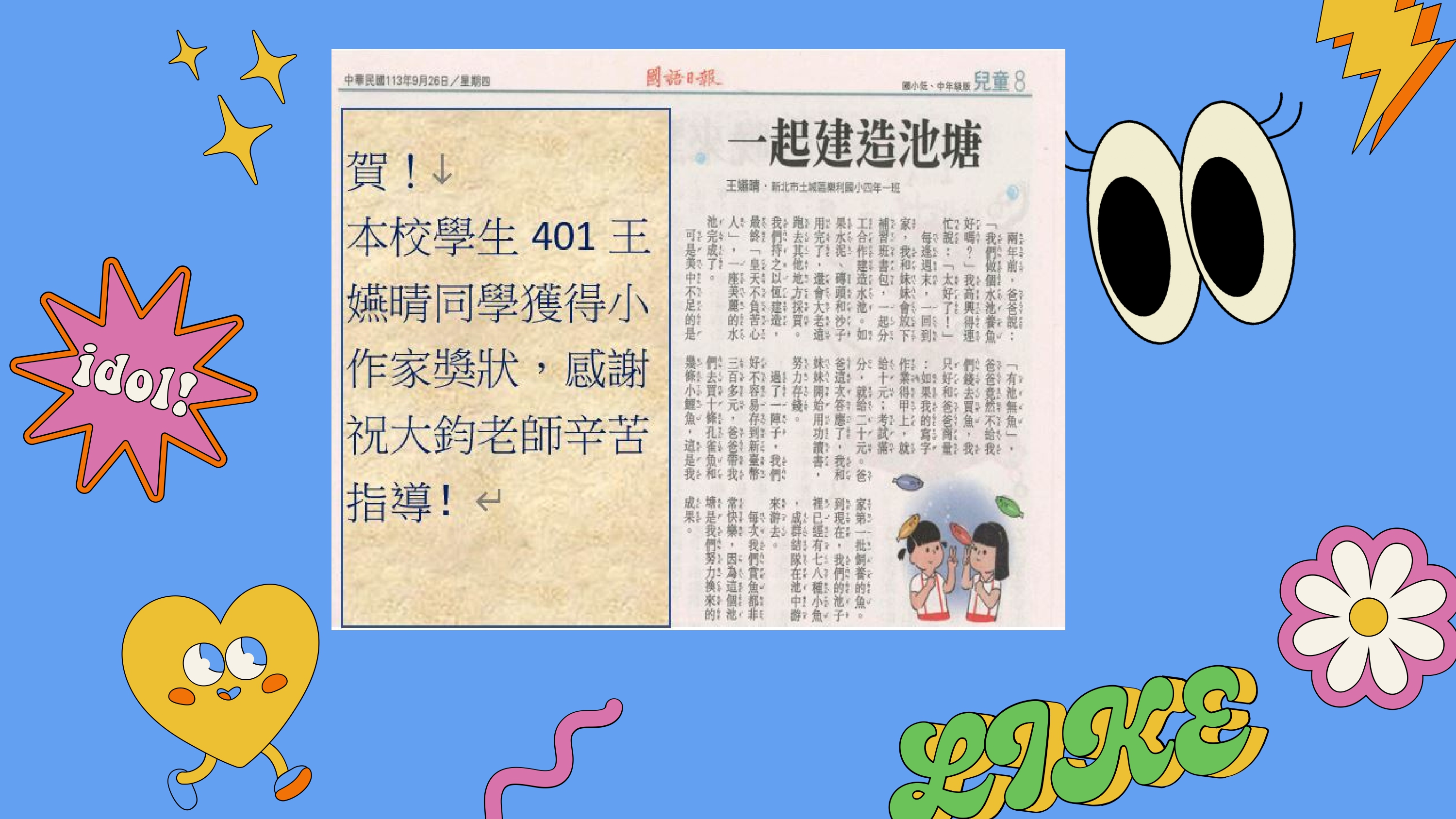 賀!本校學生四年1班王嬿晴同學參加國語日報徵文投稿.作品於113年9月26日榮載刊登,並獲小作家證書,感謝祝大鈞老師辛苦指導。